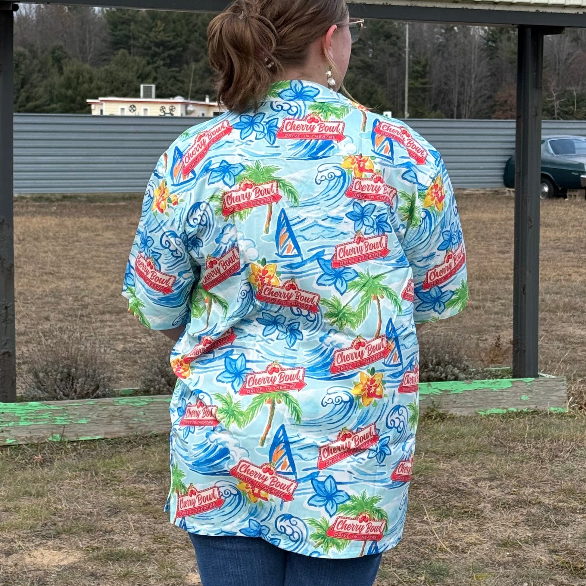 A festive Hawaiian shirt emblazoned with the Cherry Bowl Marquee Logo.